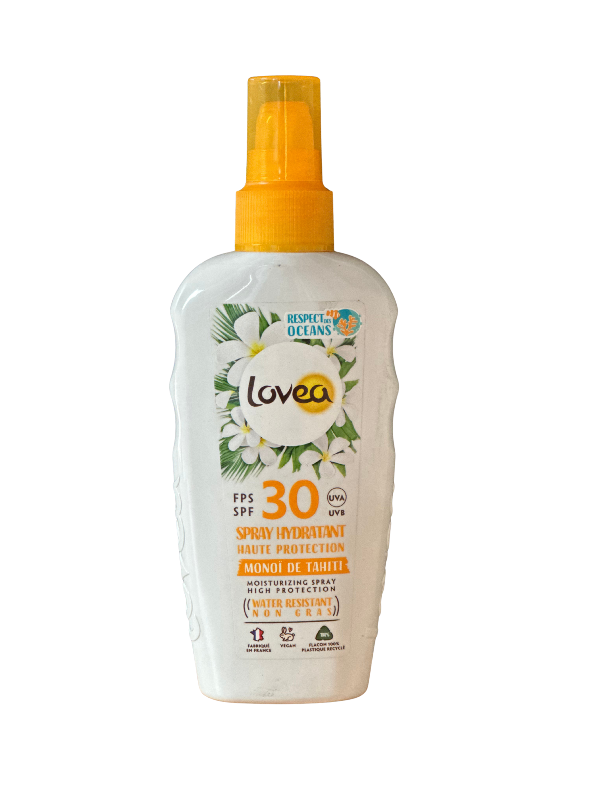 Le spray hydratant FPS 30 lovea contient des filtres solaires nouvelle génération pour un plus grand respect de votre peau. Sa formule haute protection protège efficacement des rayons UVA et UVB et permet un bronzage progressif. Enrichi en monoi de Tahiti, ce spray à la texture fluide et légère, hydratée et adoucit la peau sans laisser de traces blanches. Votre peau est protégée, hydratée et delicieusement parfumée !